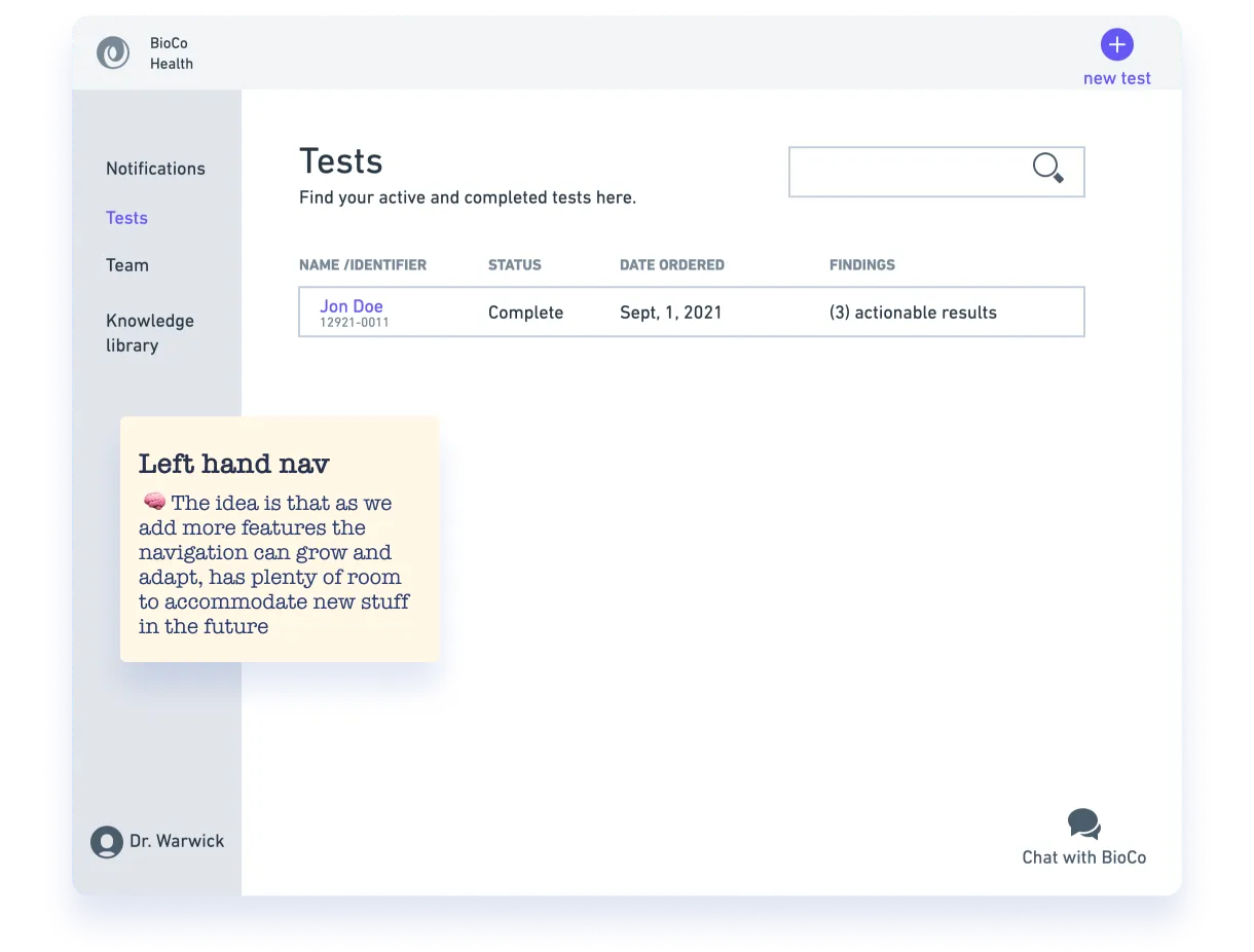 Tests data table: This is chosen to aid ease of use and familiarity. Many different layout options can be presented in an interface for items like this. Cards were dismissed in this specific case because having a more visual representation of information wouldn’t necessarily be a value-add. It’s important to note here that we’re trying to show solid thinking around these topics, not a mathematical proof that no one can argue with or that can’t be overturned. Design rationale is not a court ruling or a decree from the design gods ;). It’s also worth noting that you have to be wise about what needs to be documented and how strongly you stand behind the choice. In this case, it would be understandable to skip over the layout issue of the table vs cards and instead draw the attention to the columns which will be represented and/or the level of table functionality you expect.