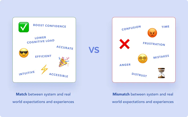 Decisions surrounding core values and functions are the highest priorities for matching between the system and the real world. If a stock trading platform uses beautiful gradients to convey information but it goes against the blatantly obvious traffic-light colours, it affects an integral aspect of the tool. Similarly, unique but misleading iconography on a medical system that causes emergency staff precious seconds to decipher could render the platform useless (or even dangerous).