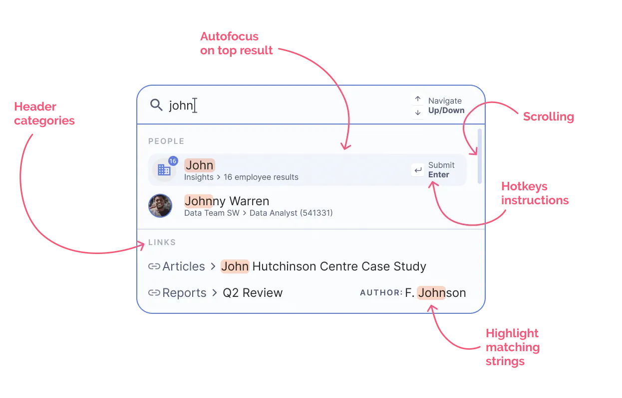 Timing is important in a search experience because, as we saw in the anatomy section, this whole flow has a lot of microinteractions involved. There’s a lot of things that happen in quick succession. From the moment you type in your 3rd character, the fuzzy matches begin and update usually instantly. This means that selection within the dropdown and hitting hotkeys or submitting your query needs to be smooth, free of confusing and jarring lags. The situation where you’re trying to select something but at the very last second it moves and you click the wrong thing…argh!!! These awkward moments can be quite difficult to avoid because of this fun thing we call performance ;)…which devs and designers alike have nightmares about. One tip here is considering disabling certain functions while the user is mousing or tabbing around. Then the awkward misfire moments might be prevented in some cases.